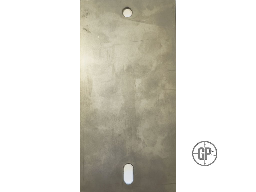 Tabulka dle předepsaných rozměrů ( 2 x 100 x 200 mm ) z nerez plechu jakosti 1.4404 se dvěma otvory (1 kulatý, 1 oválný) pro připevnění k ochranné tyči.
