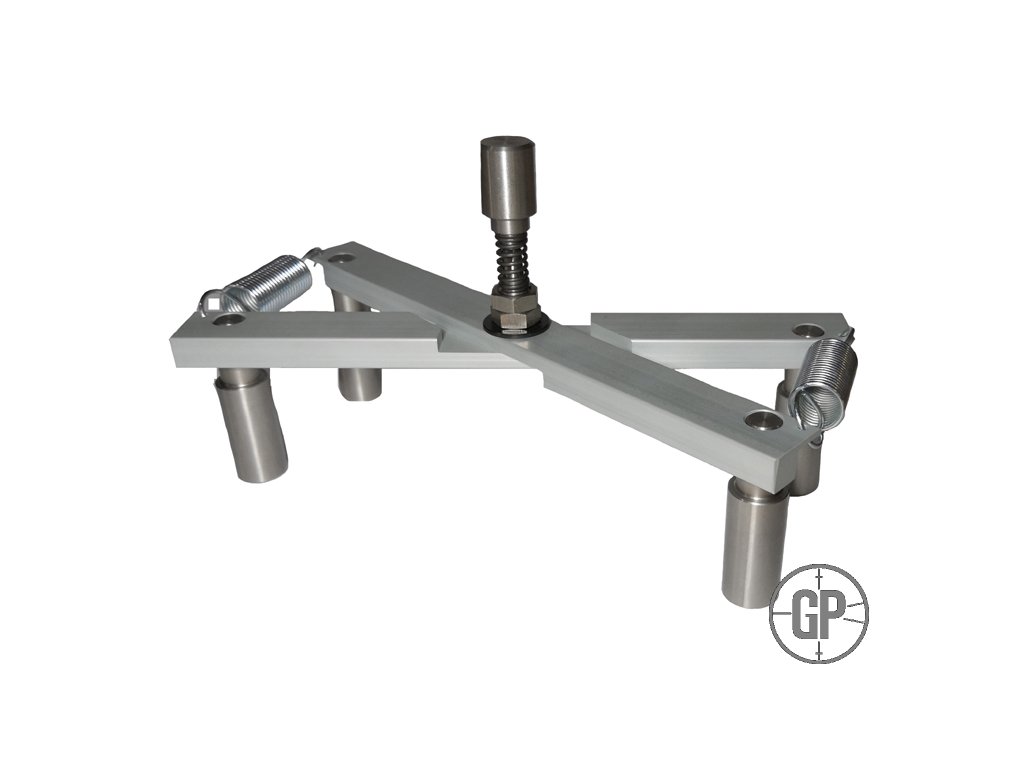 Středící nůžky na kolejnici s důlčikem. Dulčík se dá bez použití nástrojů vytáhnou a místo něj můžete umístit například hranol.